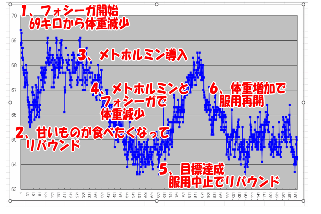 - 開始直後(0〜40日頃):フォシーガを飲み始めてスルスル体重が減少。
